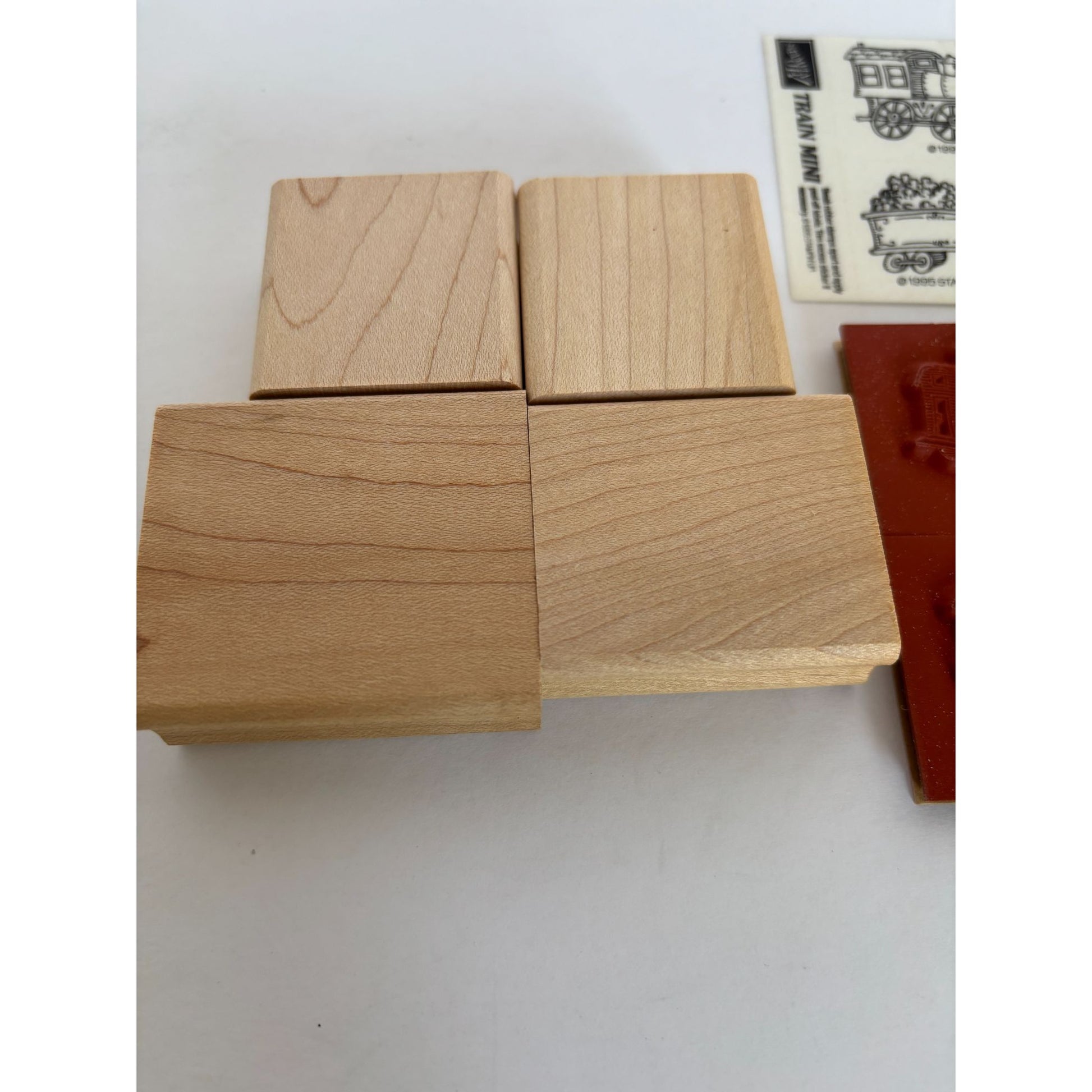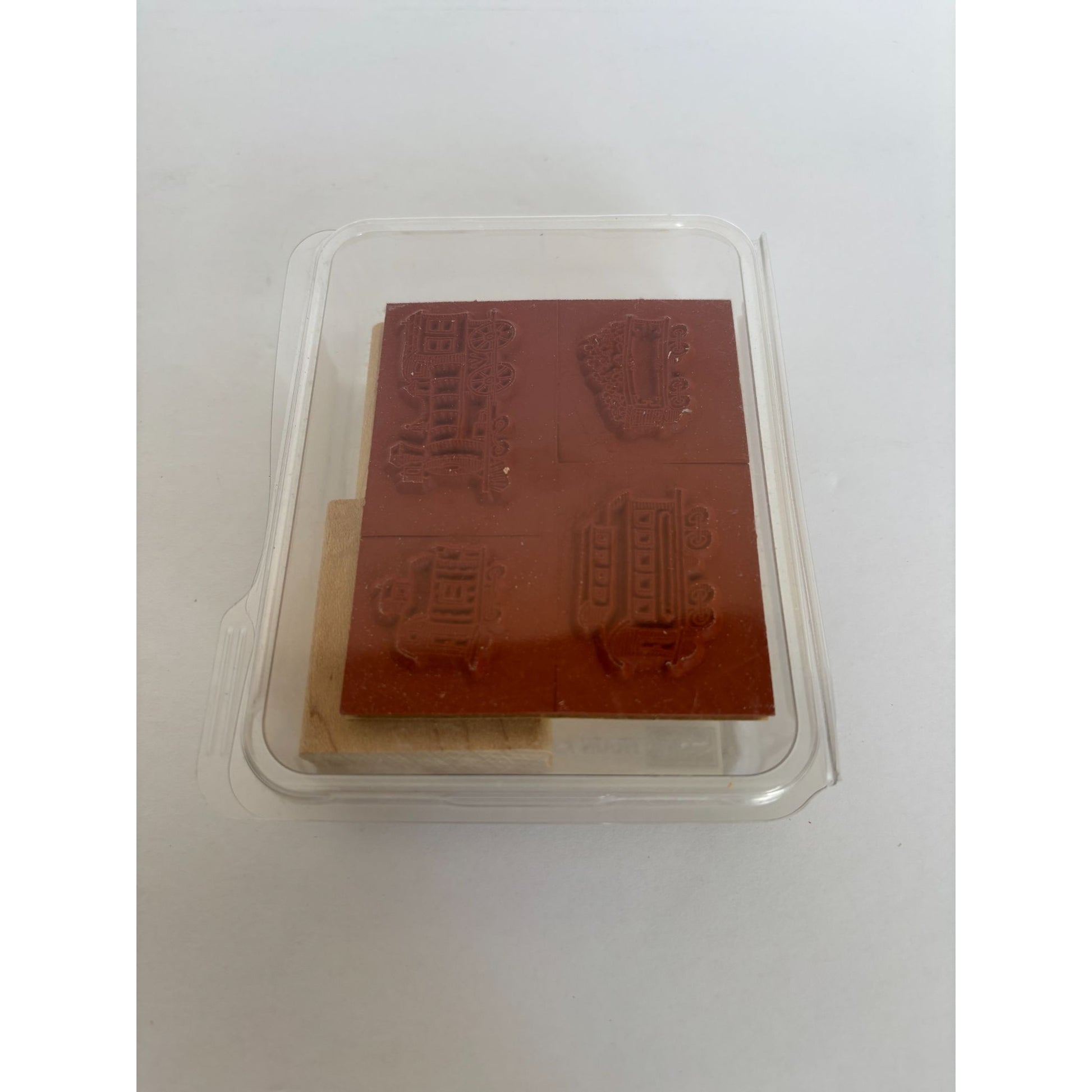 Versatile wood-mounted train-themed rubber stamps ideal for crafts, scrapbooking, and DIY projects. High-quality designs ensure sharp and detailed impressions.