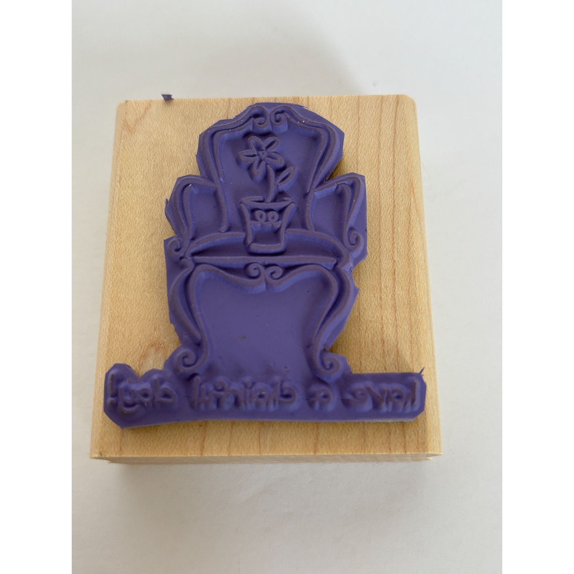 Wooden rubber stamp featuring a chair and flower pot design with text that reads "Have a chairful day!". This delightful pun is great for creating a card for a friend.