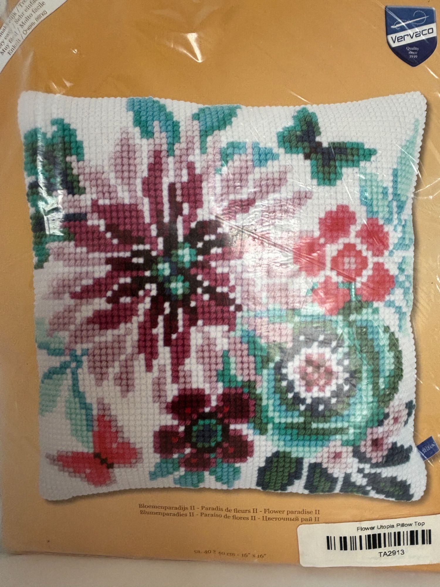 This Flower Utopia Pillow Top features a vibrant cross-stitch design that adds a touch of artistry and color to any living space. With a size of 16"x16", it easily fits standard pillows, providing an elegant and handcrafted appeal to your home decor.