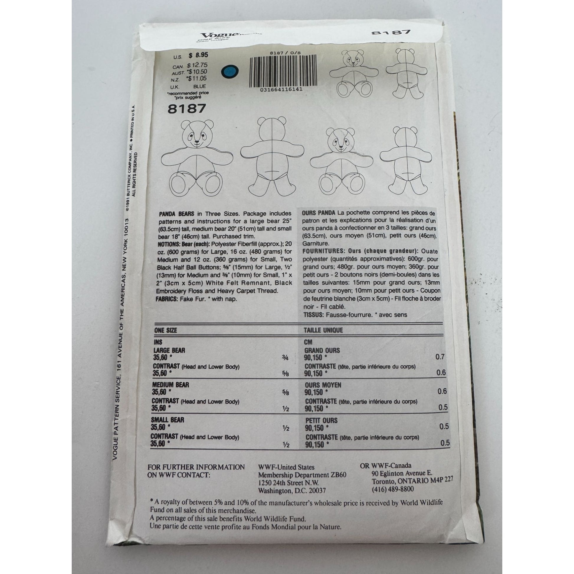 Vogue Craft Sewing Pattern 8187: Plush Panda Bears