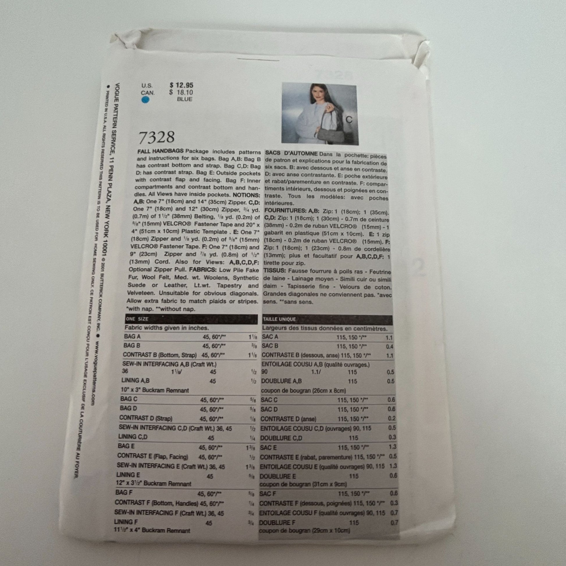 Vogue Sewing Pattern 7328 Fall Handbags Purse Work Accessory Accessories Uncut