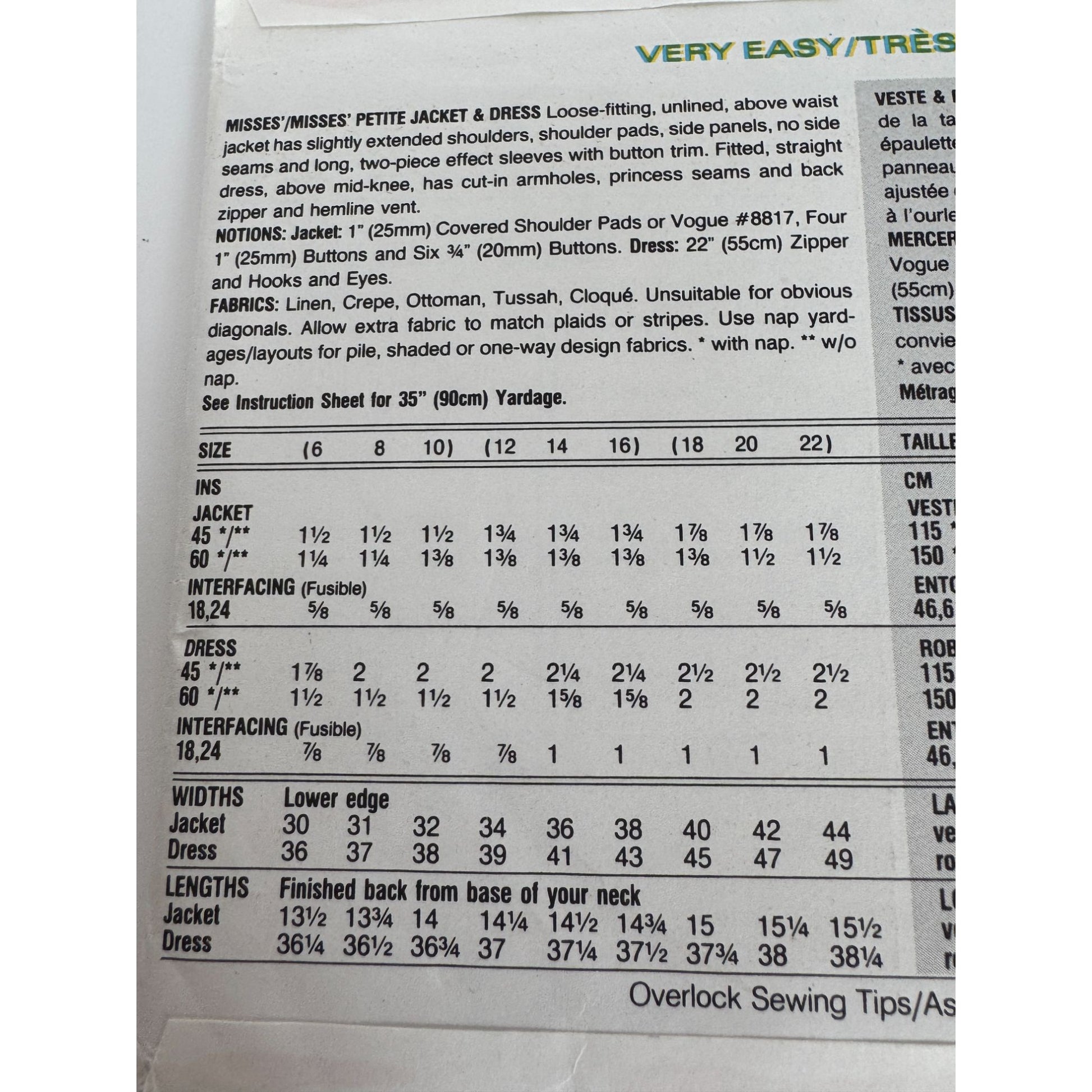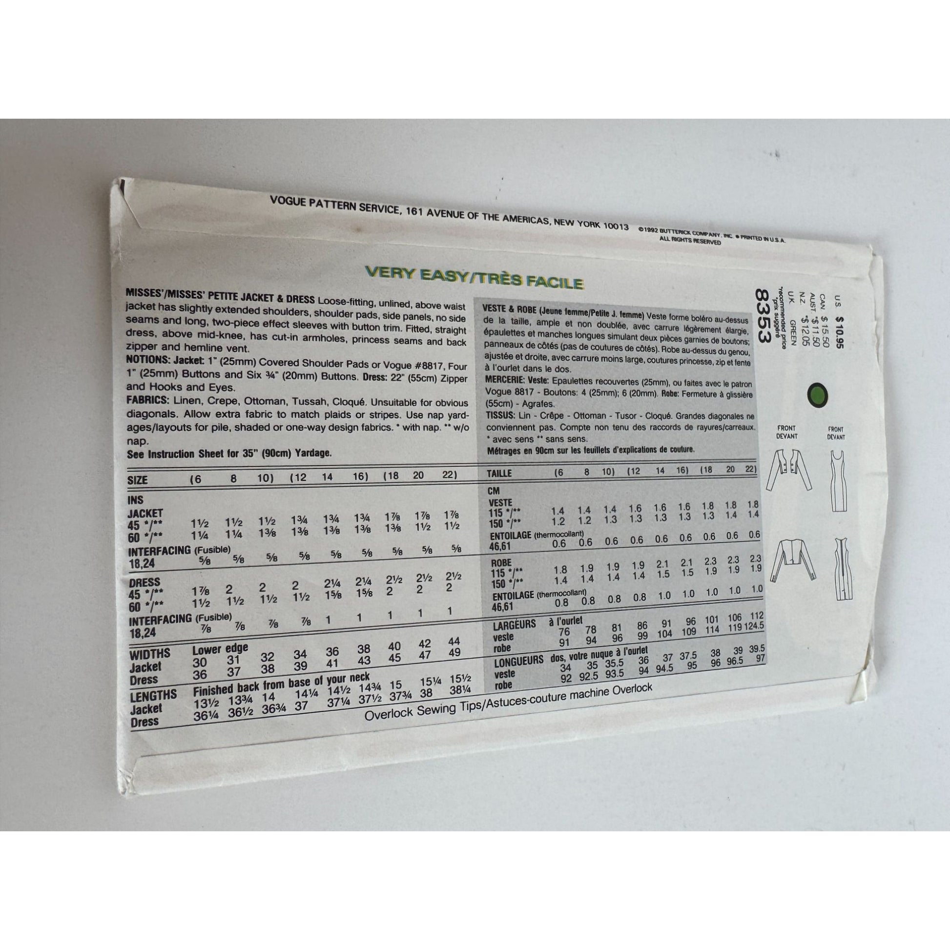 Vogue Sewing Pattern 8353 Misses Career Jacket and Dress Sizes 6 8 10 Easy Uncut