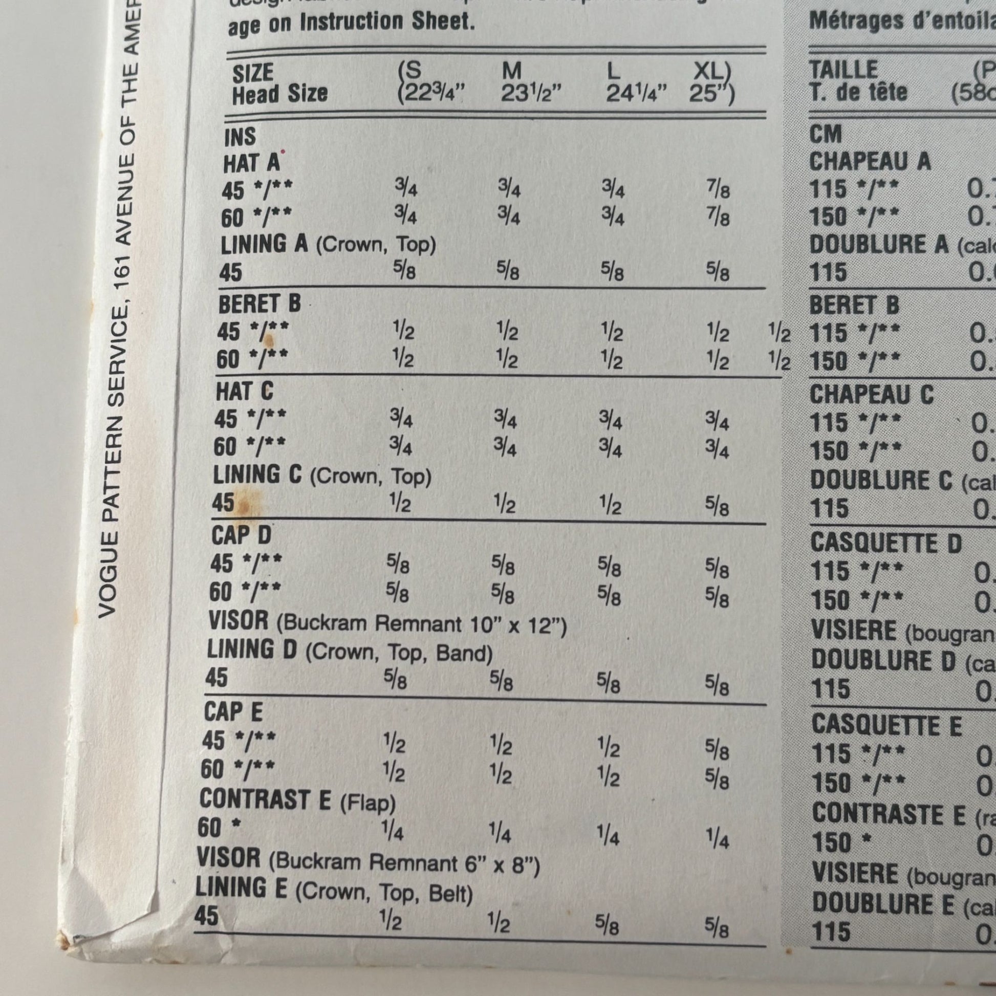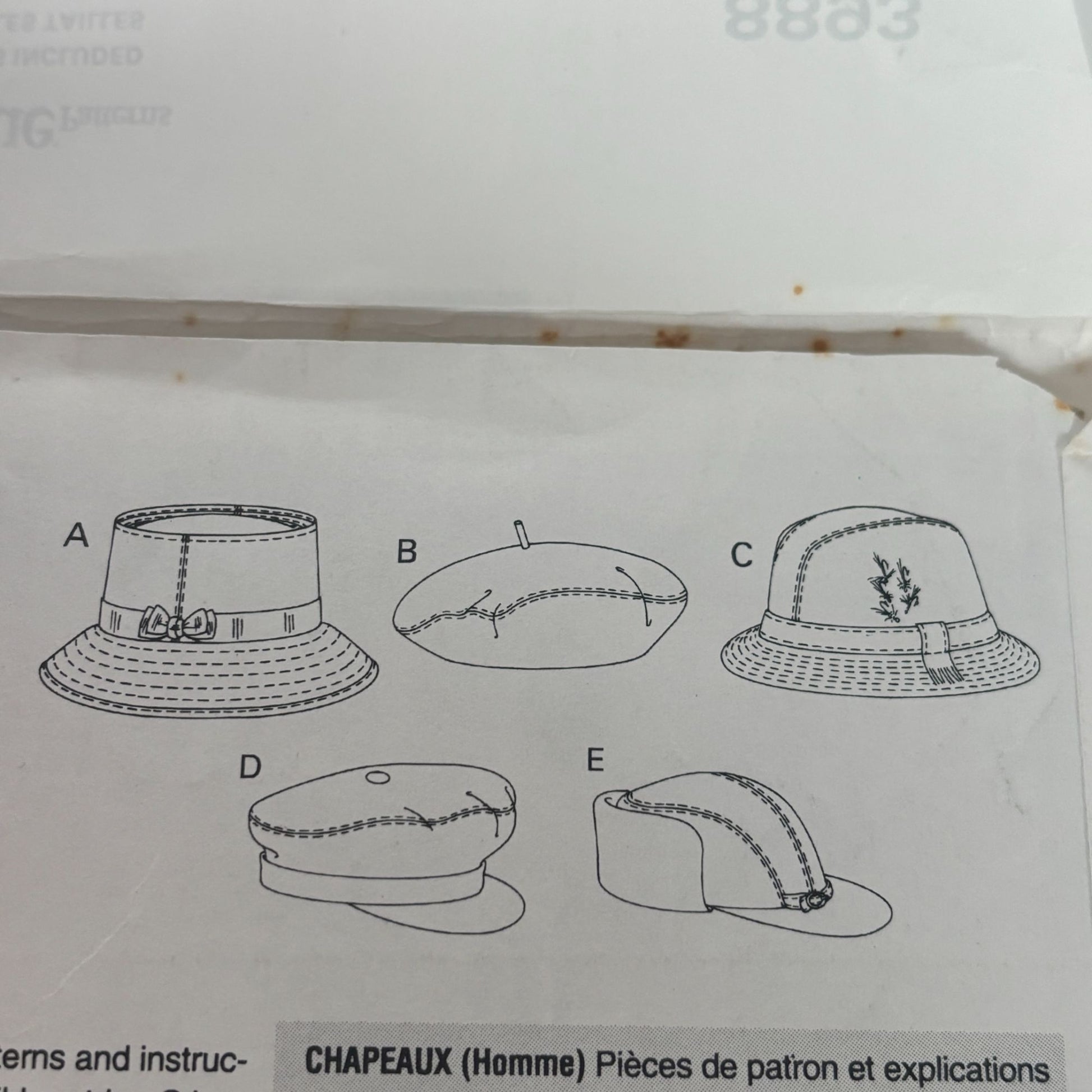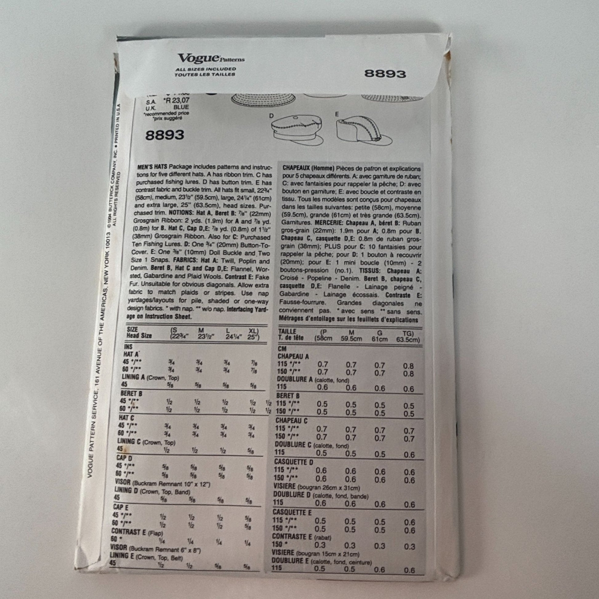 Vogue Sewing Pattern 8893 Hat Beret Bucket Trilby Hunters Newsboy Messenger Golf