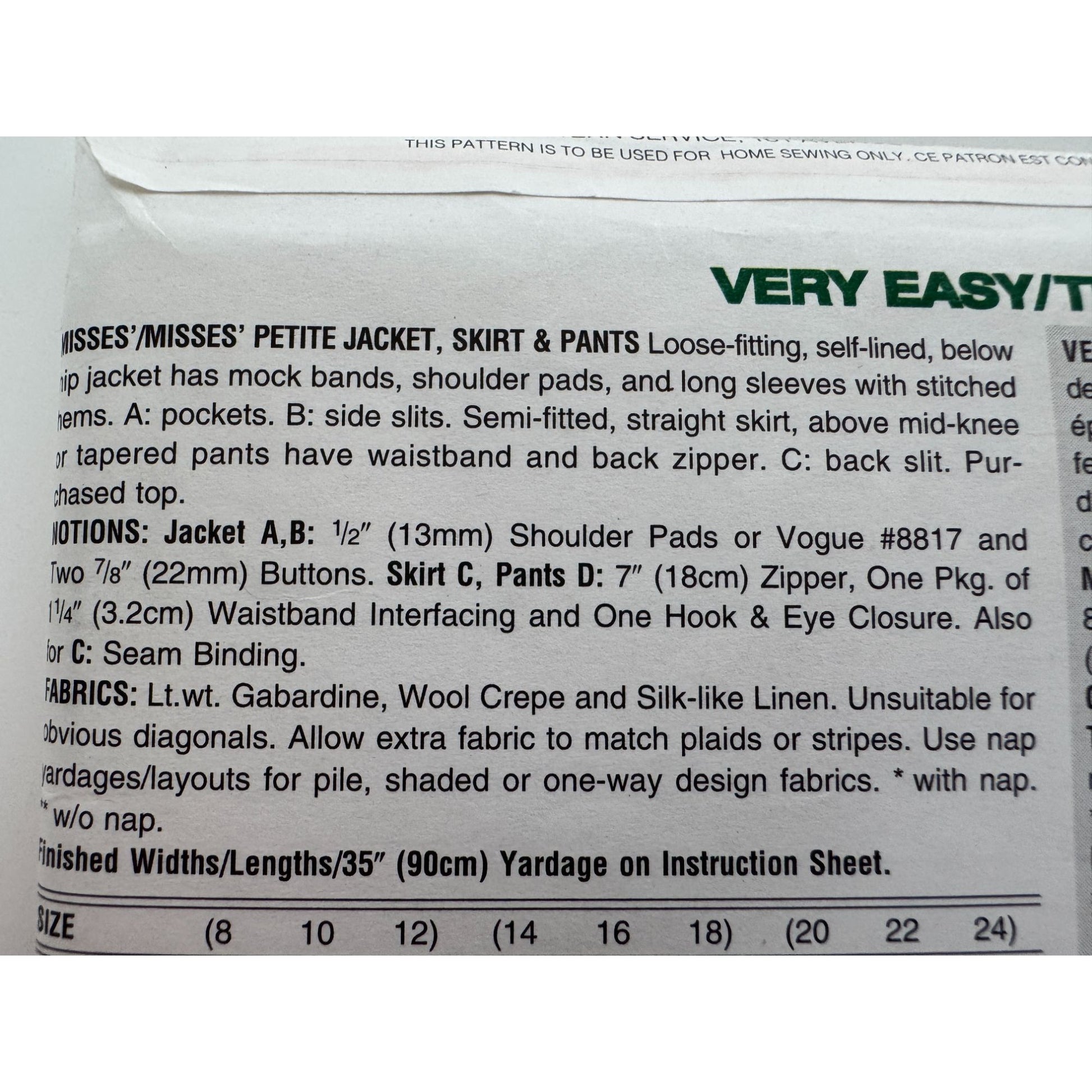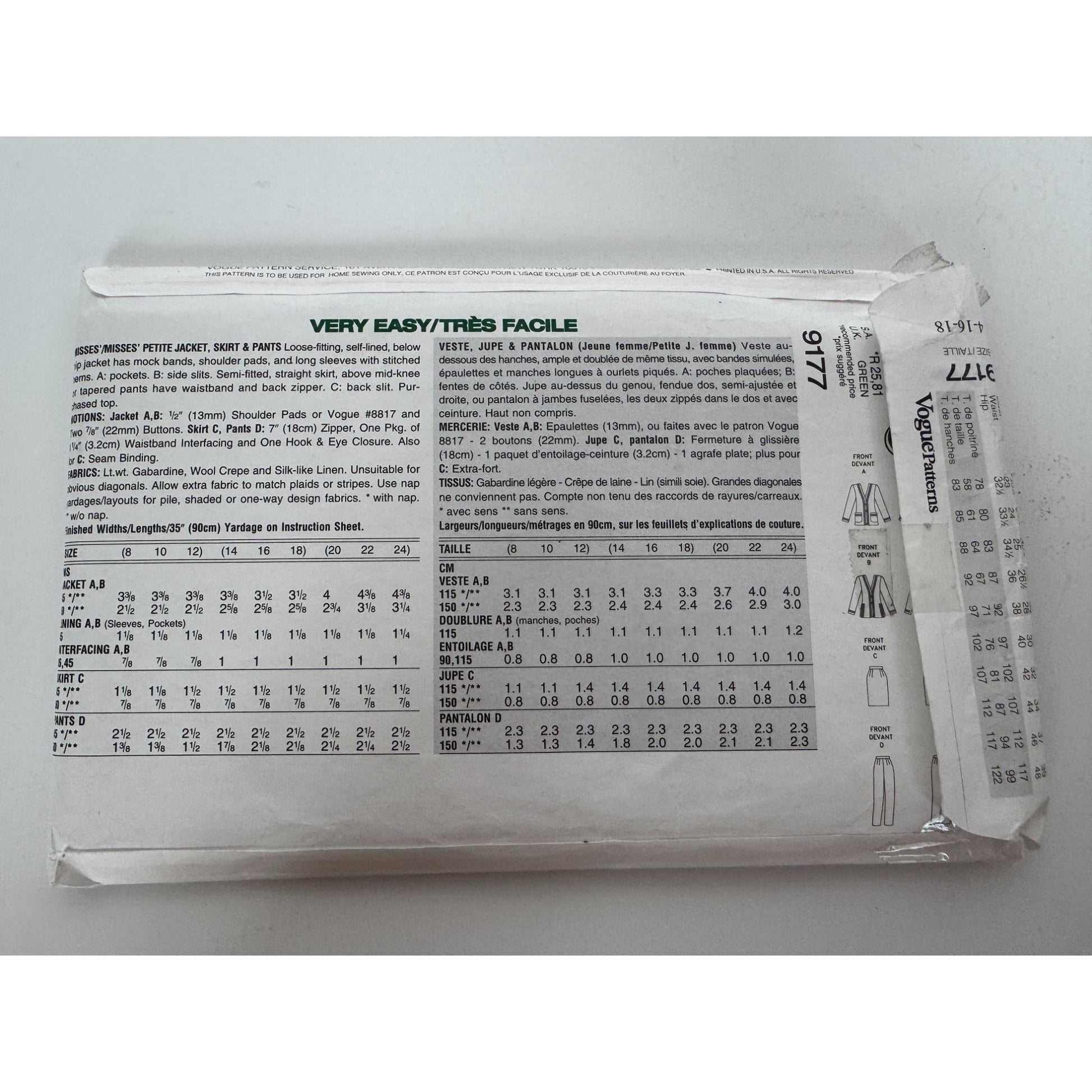 Vogue Sewing Pattern 9177 Jacket Skirt Pants Work Suit Outfit Easy 14 16 18 UC