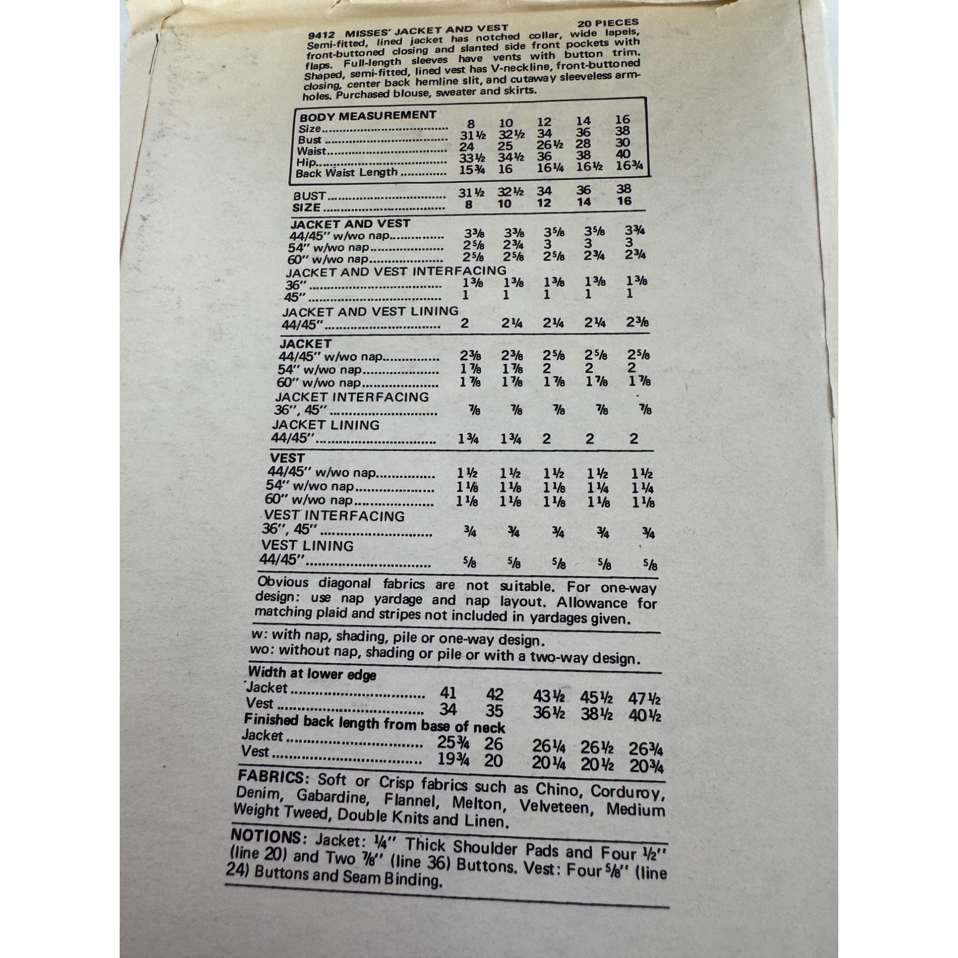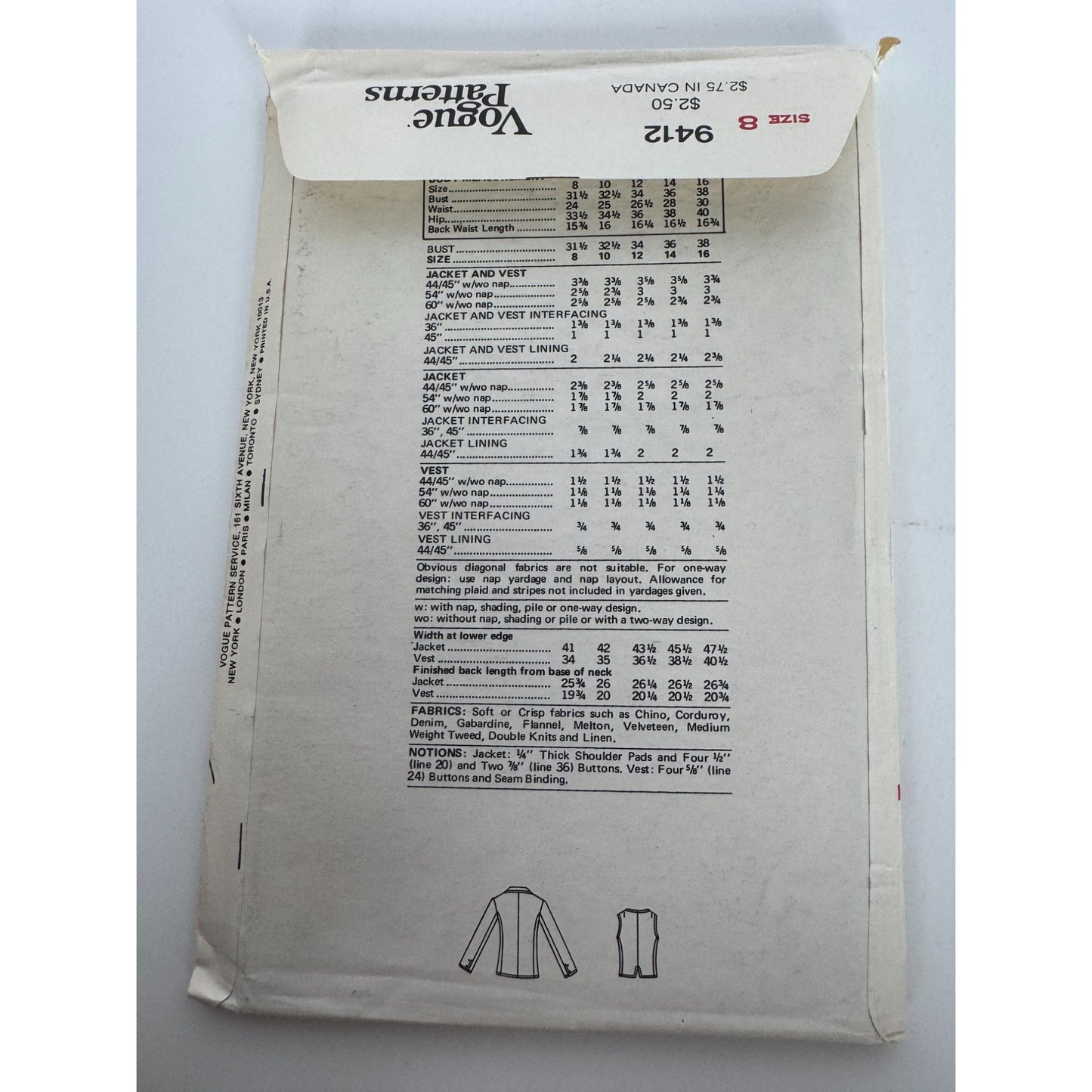 Vogue Sewing Pattern 9412 Misses Jacket Wide Lapels V-Neck Vest Preppy Sz 8 UC