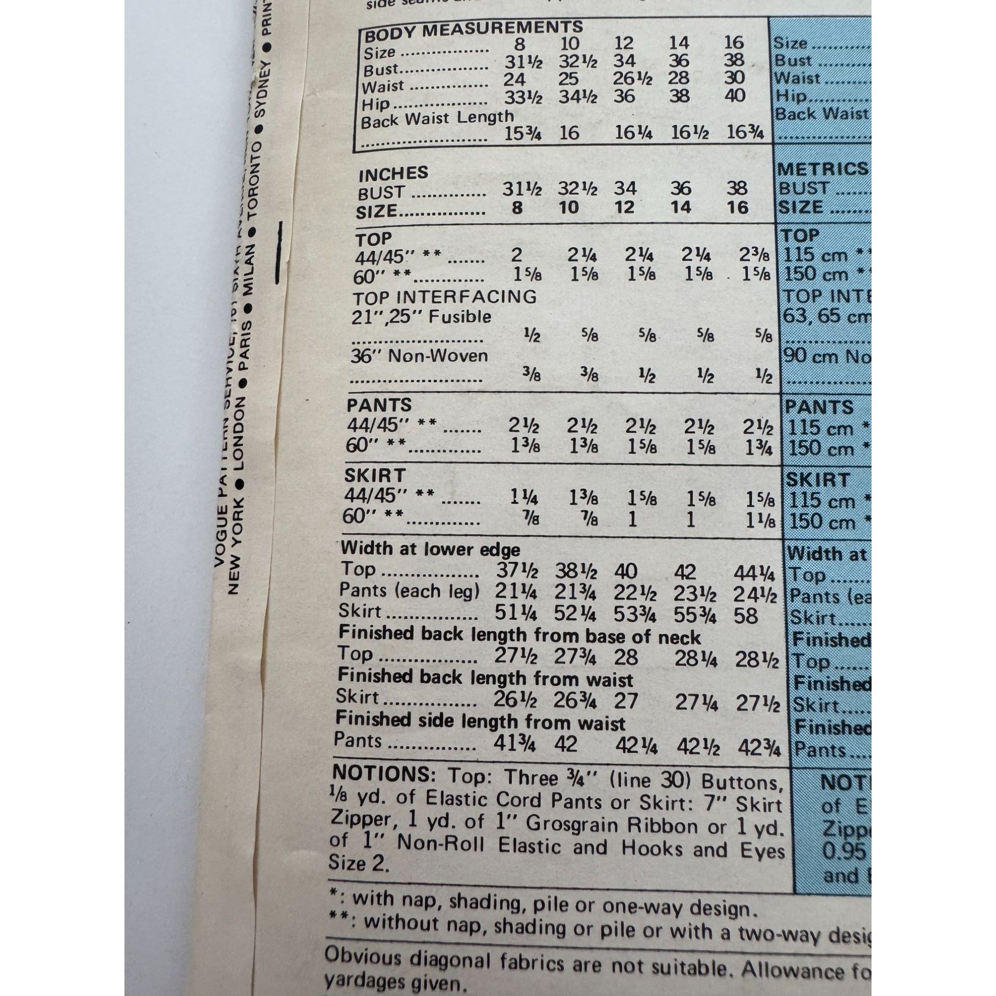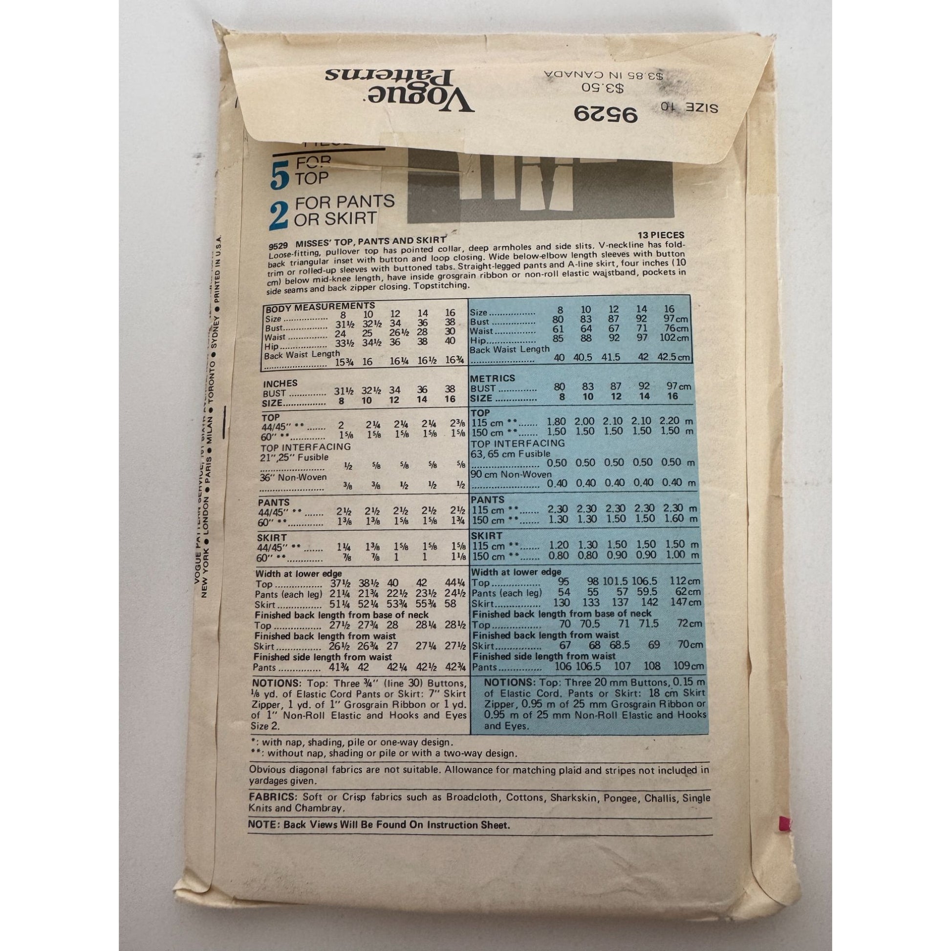 Vogue Sewing Pattern 9529 Misses Top Straight Pants A-Line Skirt Size 10 Uncut