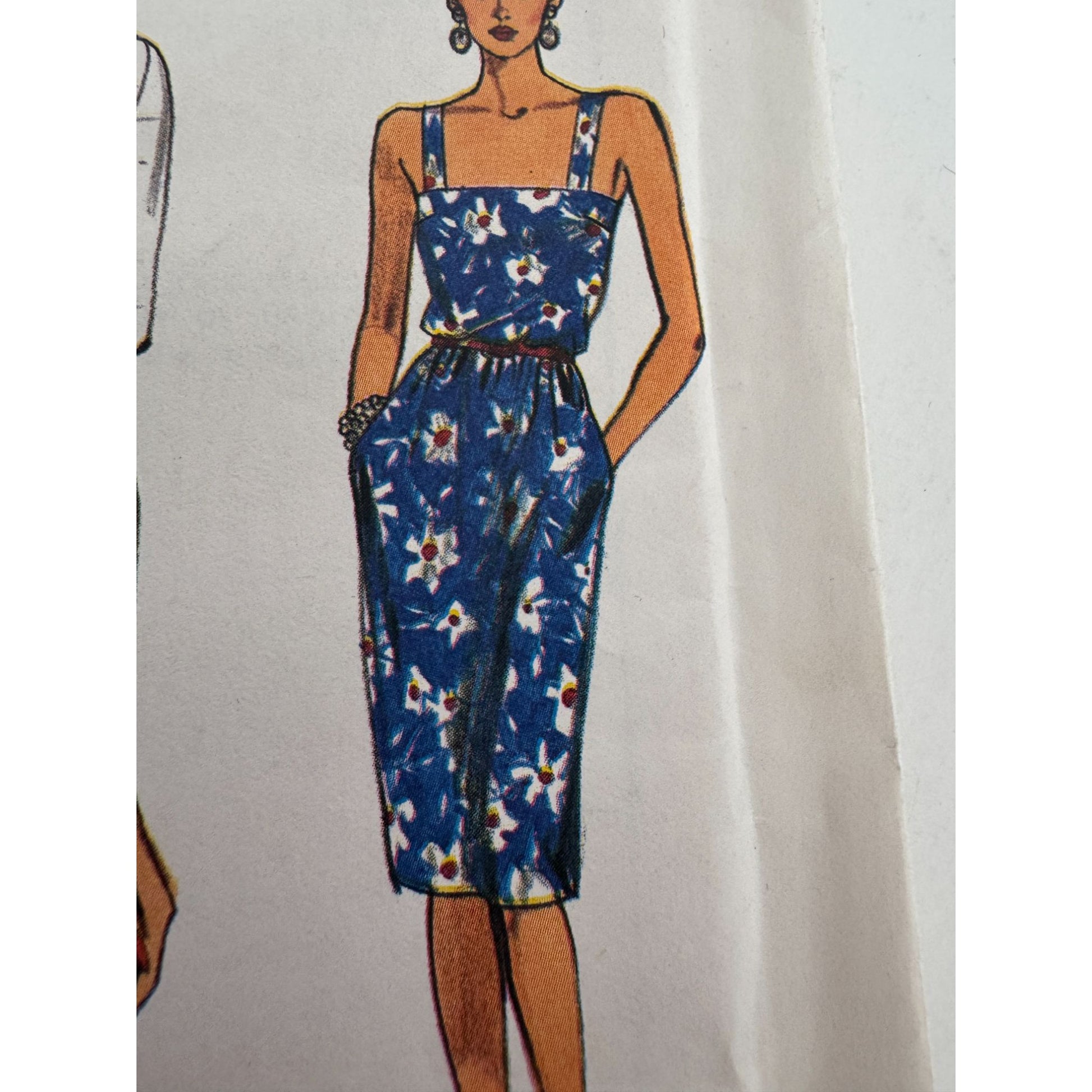 Loose-fitting, unlined, above hip jacket has slightly extended shoulders, shoulder pads, self-lined front, shaped hemline and above elbow sleeves. Straight dress, below mid-knee, has shoulder straps, close-fitting, blouson bodice, elastic waist, side pockets and back hemline slit.
