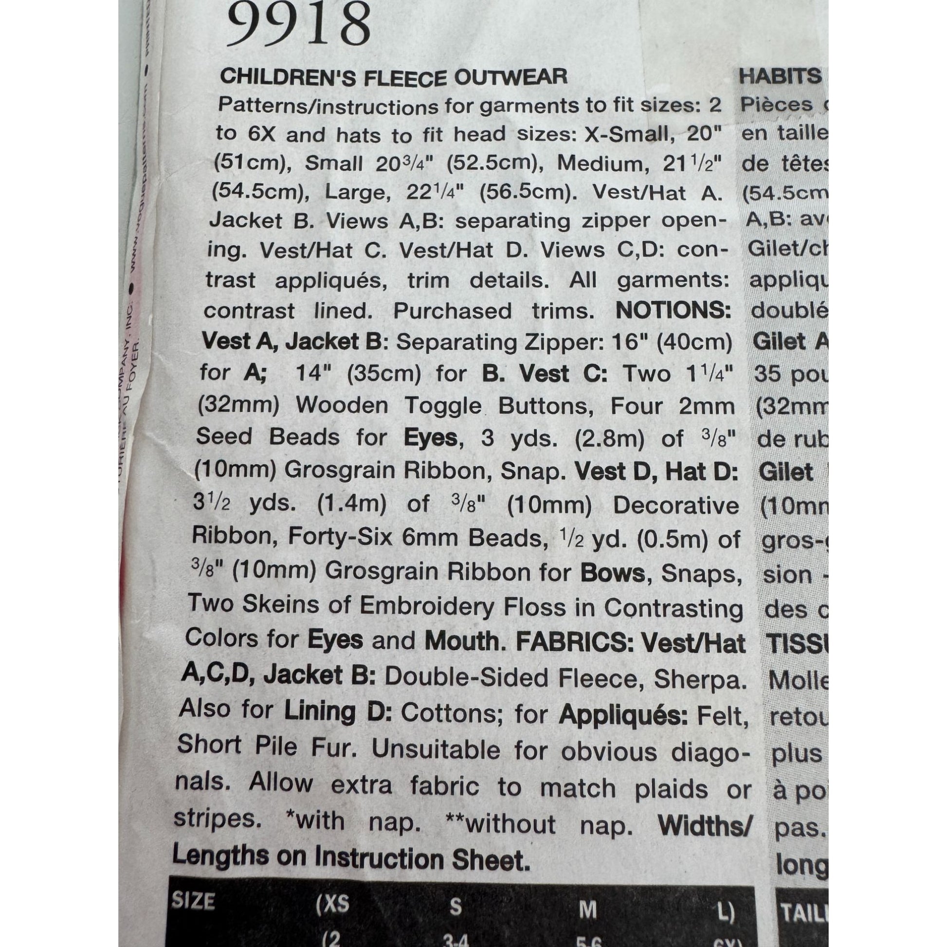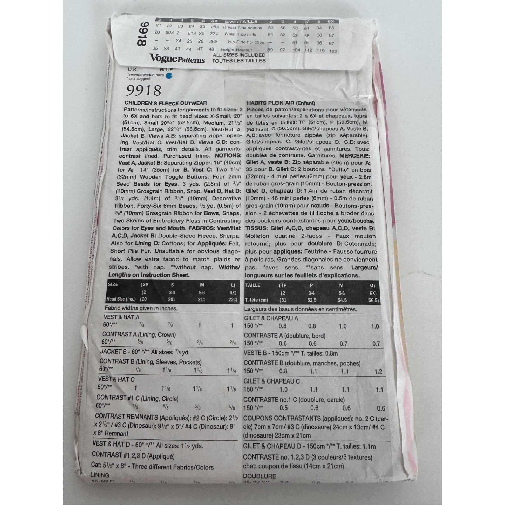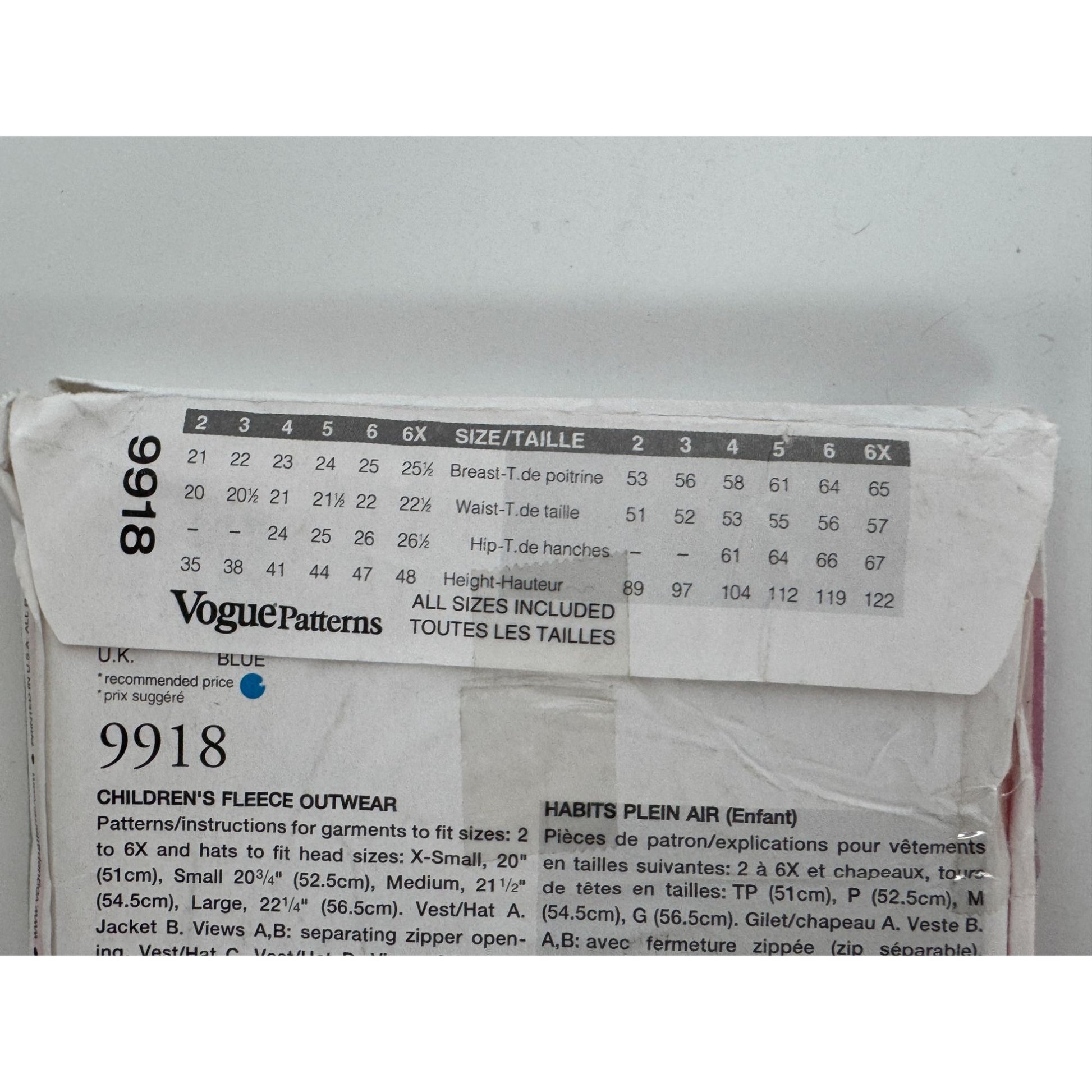 Vogue Sewing Pattern 9918 Childrens Fleece Outerwear Winter Clothing Kids 2-6X