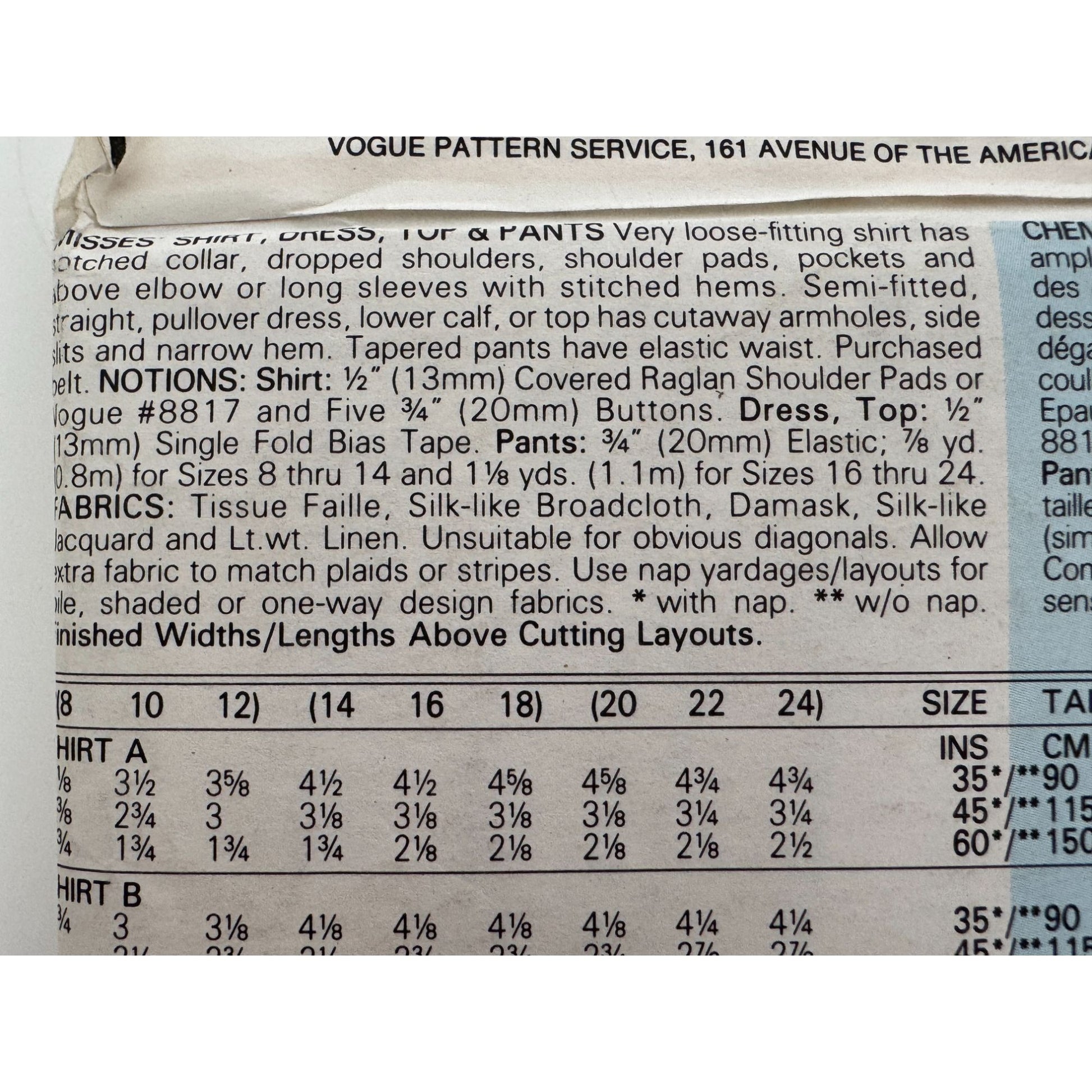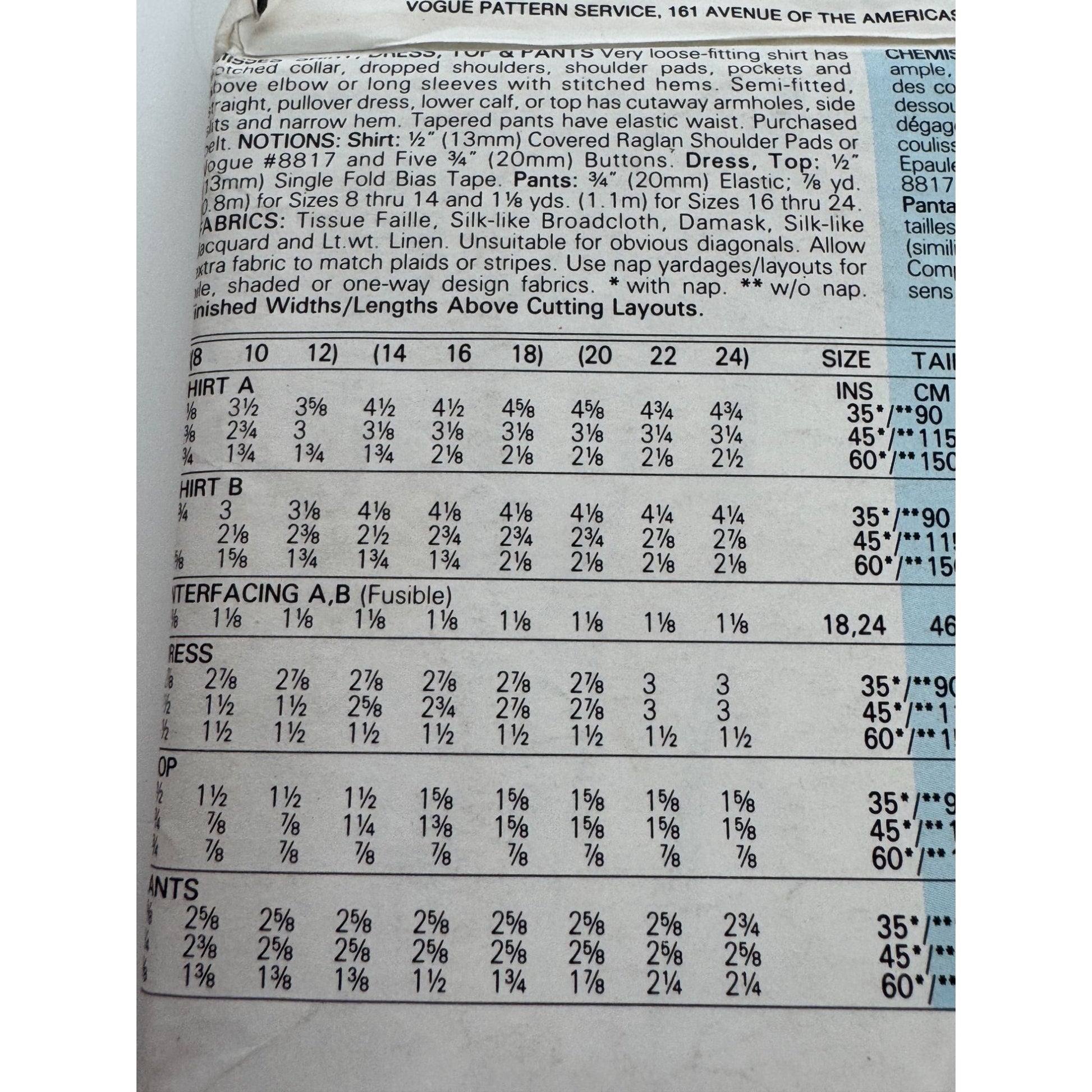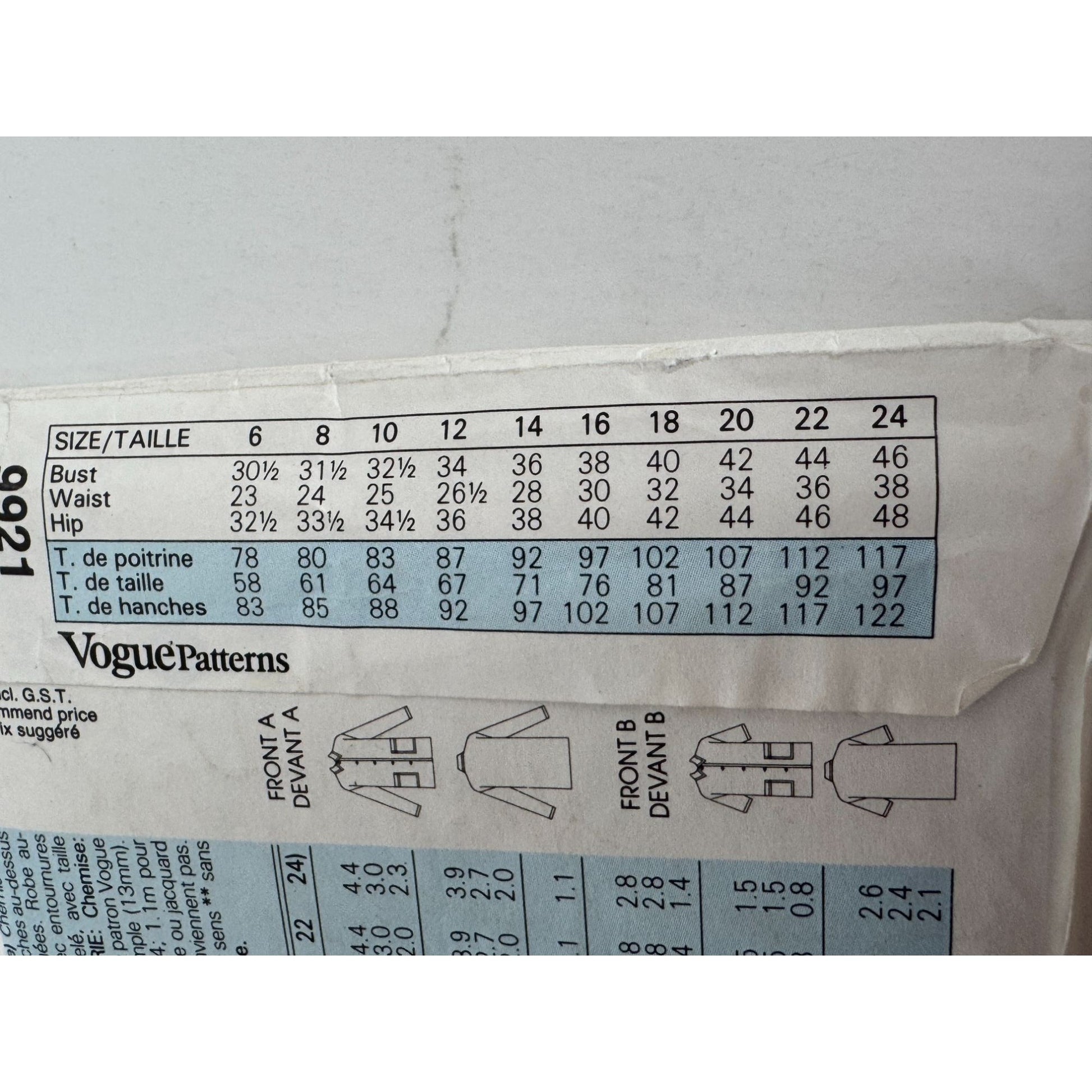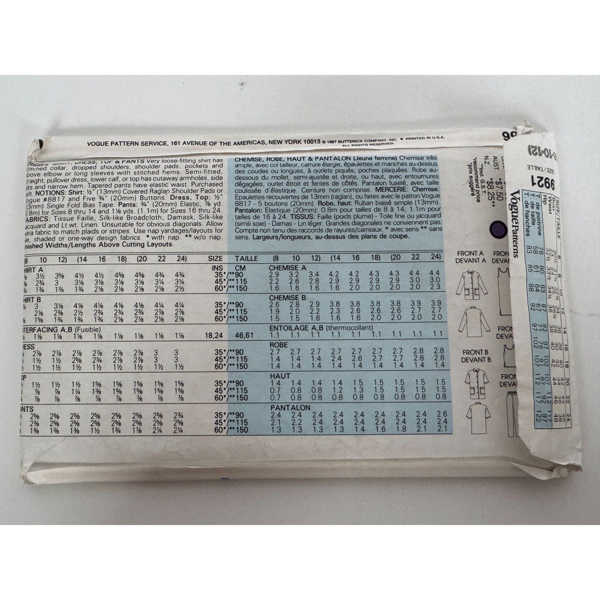 Vogue Sewing Pattern 9921 Shirt Dress Pants Set 1980s Vintage Outfit 8 10 12 UC