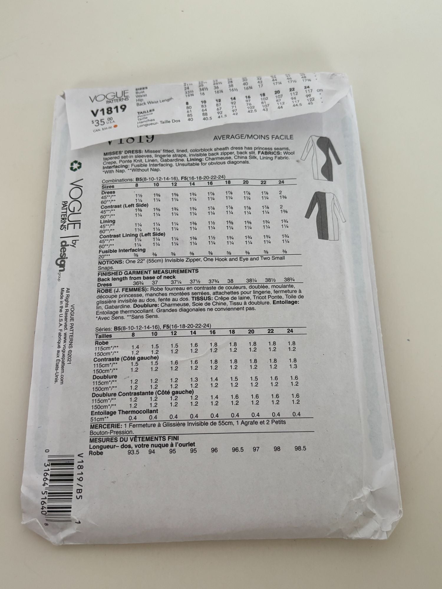Vogue Sewing Pattern V1819 Sheath Dress Color Block Work Career Fall 8-16 Uncut