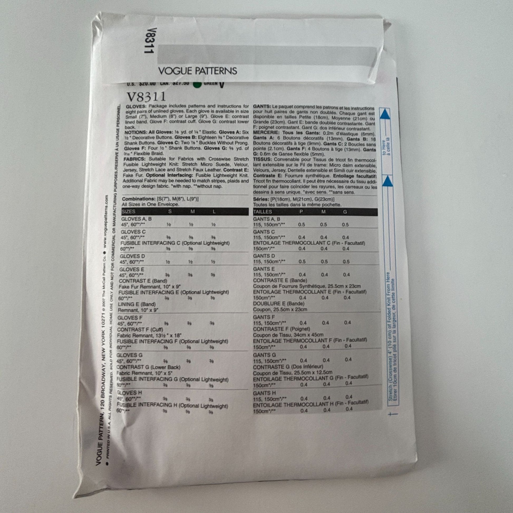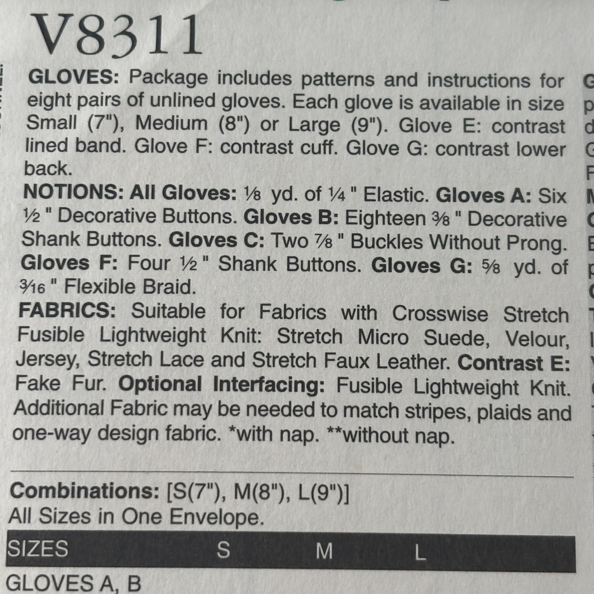 Vogue Sewing Pattern V8311 Stretch Gloves S M L Driving Winter Accessories UC