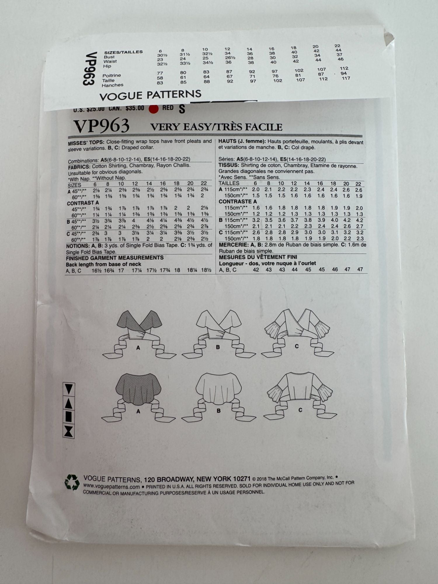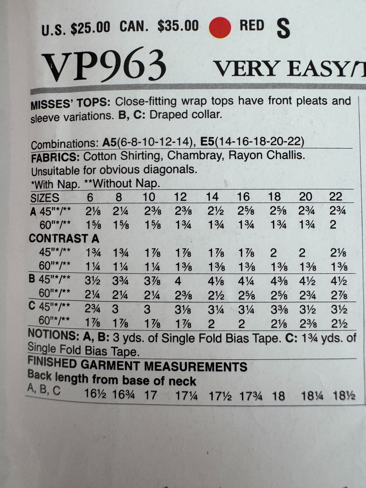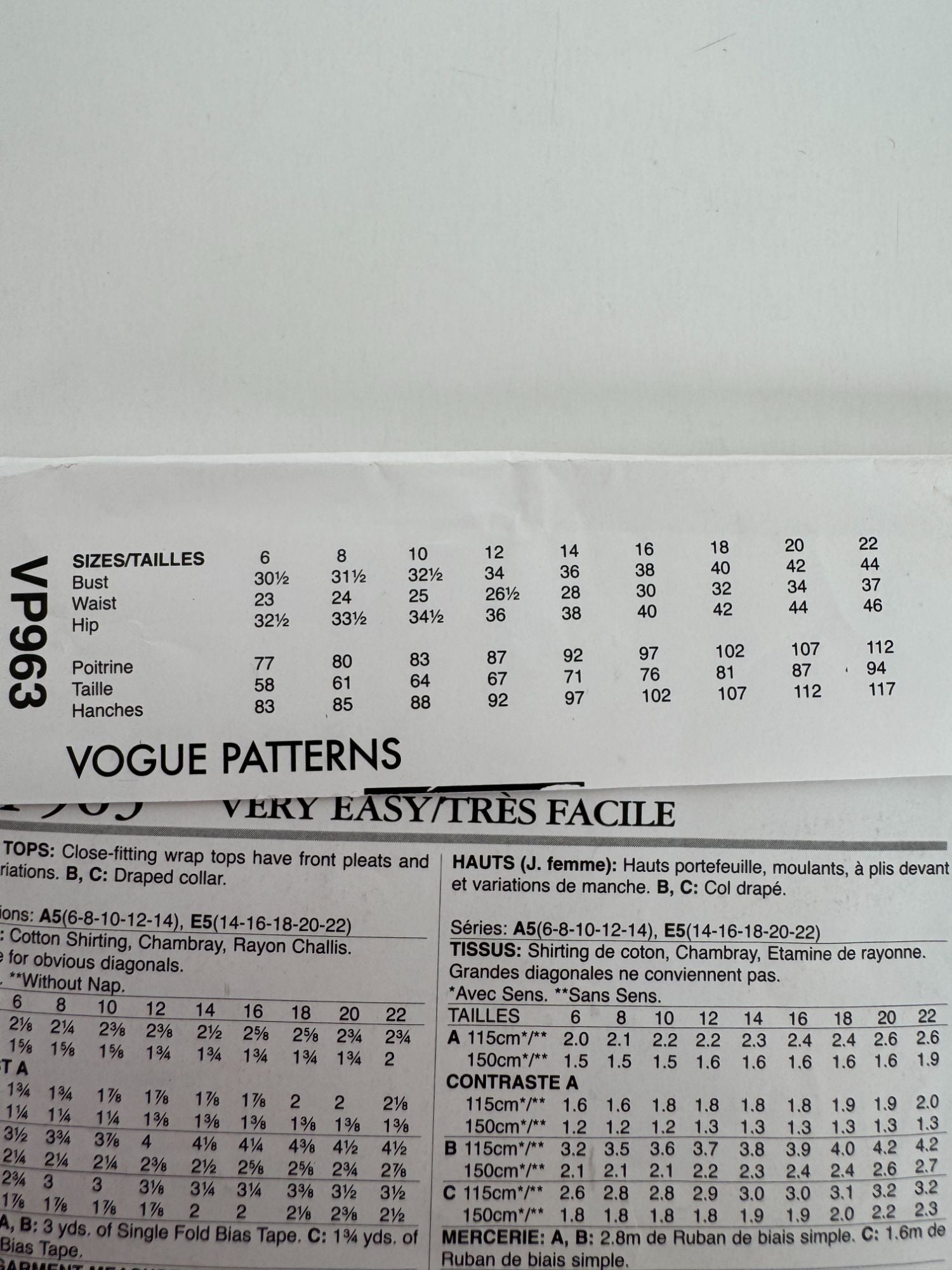Vogue Sewing Pattern VP963: Misses' Tops